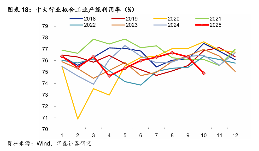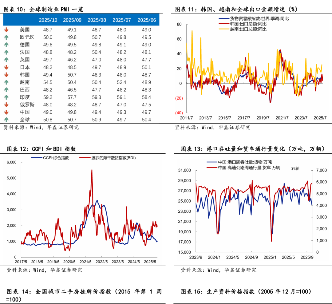 内需方面,最新一周二手房价格下跌,数量指标涨跌互现。高速公路货车通行量回落, 2025年4月十行业拟合的产能利用率5-8月持续回升,9-10月持续回落。汽车成交量处于历史同期较高水平,新房成交持续处于历史最低,二手房成交相对历史季节性回落。截至11月2日,全国城市二手房挂牌价指数较上周环比下降0.21%。截至10月24日,生产资料价格指数较上周环比上涨0.4%。