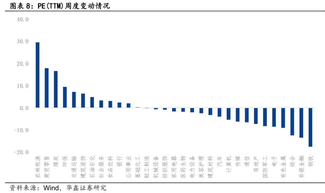本周申万一级行业PE(TTM)中农林牧渔、商贸零售、煤炭、环保、交通运输涨幅最大,变动幅度分别在29.5%、17.9%、16.6%、9.5%、7.2%,钢铁、非银金融、综合、有色金属、电子涨幅最小,估值变动幅度分别在-17.6%、-13.5%、-12.4%、-9%、-8.5%。