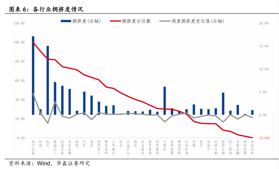 截至11月7日,拥挤度前五的行业为电力设备、电子、基础化工、机械设备、计算机,分别为17.1%、15%、7.1%、6.3%、6.1%。排名后五为美容护理、综合、纺织服饰、社会服务、煤炭,分别为0.2%、0.3%、0.7%、0.7%、0.8%。