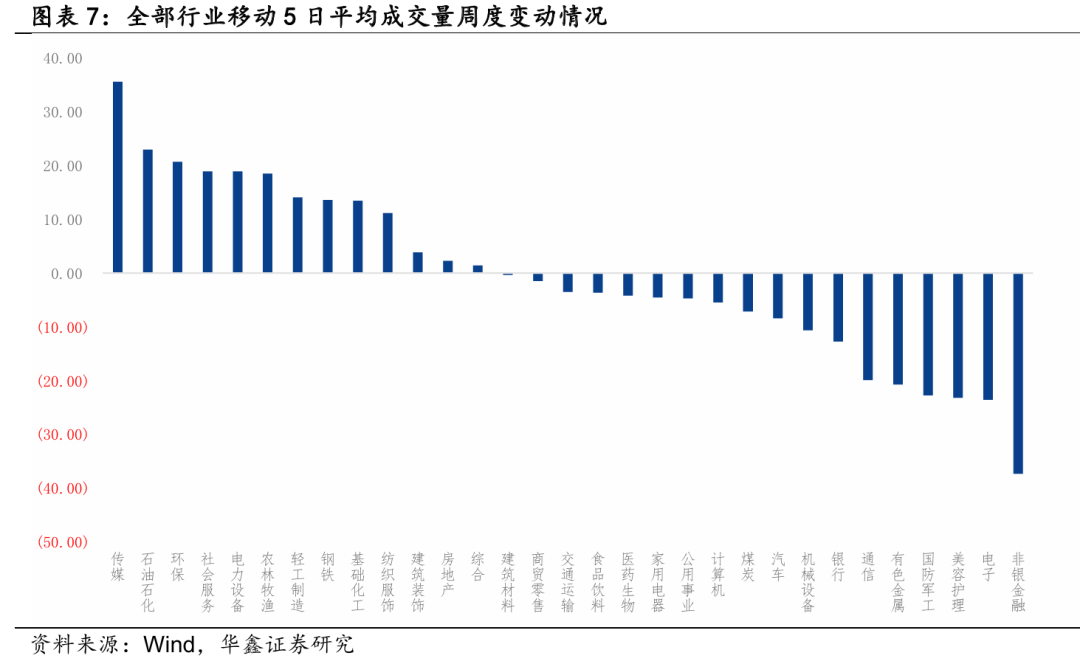 本周全A日均成交量2.01万亿元,较上周2.3万亿元下降。传媒、石油石化、环保、社会服务、电力设备成交量同比增速最高,成交量变动分别在35.6%、23%、20.7%、18.9%、18.9%。非银金融、电子、美容护理、国防军工、有色金属成交量涨幅最小,成交量变动分别在-37.4%、-23.6%、-23.2%、-22.7%、-20.8%。