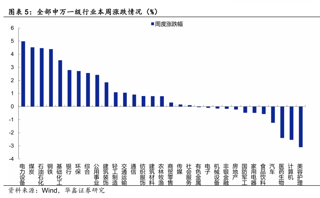 本周A股缩量上涨。上证指数涨1.1%,深证成指涨0.2%,创业板指涨0.65%。申万一级行业中电力设备、煤炭、石油石化、钢铁、基础化工涨幅最大,本周分别上涨5%、4.5%、4.5%、4.4%、3.5%,美容护理、计算机、医药生物、汽车、食品饮料跌幅最大,周涨跌幅分别在-3.1%、-2.5%、-2.4%、-1.2%、-0.6%。