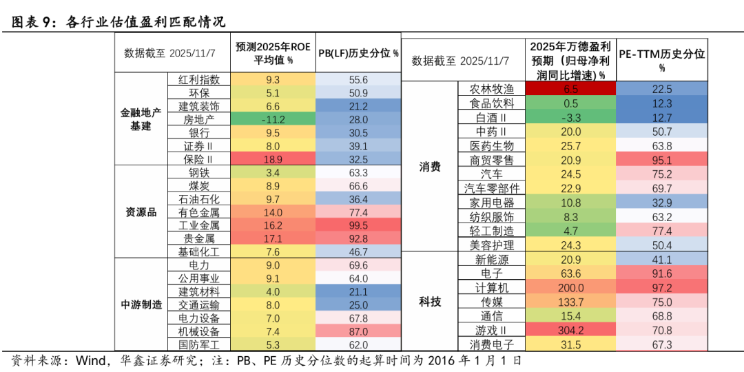 估值盈利匹配方面,截至2025年11月7日,2024年全年盈利预测较高,且当下估值相对历史偏低的行业有银行、保险、石油石化、交通运输、医药生物、美容护理、消费电子。