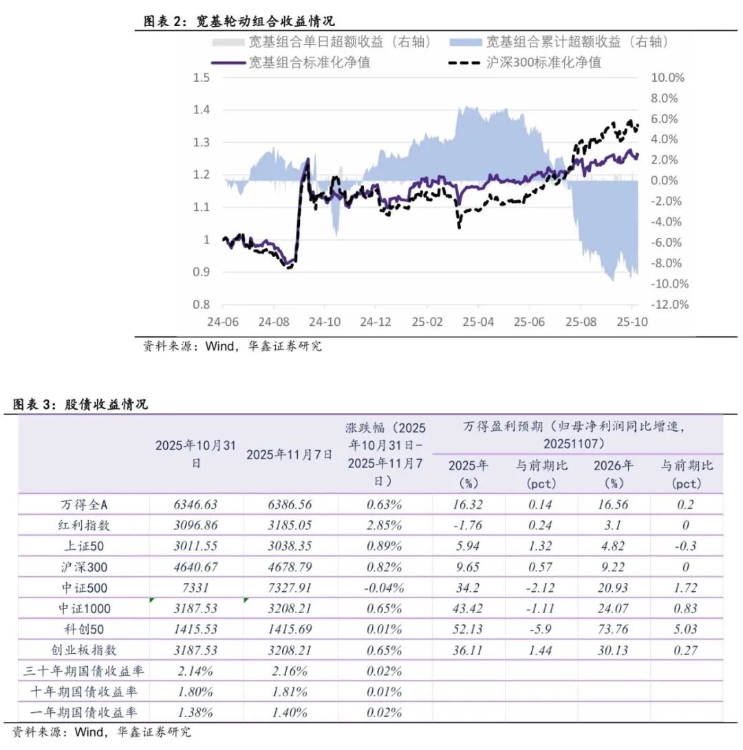 上周资金面边际上基本平稳,月初恢复情况一般,目前判断11月资金面高点出现在6日,后续宏观流动性边际收敛概率上升,这基本符合我们此前的判断。股牛债熊,权益风格上转为价值占优;债券收益率方面,长短端全面上行,股债性价比偏向股票。十债收益率累计上行2个基点至1.81%,一债收益率累计上行2个基点至1.40%,期限利差稳定在41个基点,30年国债收益率全周累计上行2个基点至2.16%。我们全仓权益,风格偏向价值,整体表现尚可,宽基轮动策略全周跑输沪深300指数-0.69pct。2024年7月建仓以来宽基轮动策略累计跑输沪深300指数-8.96pct,最大回撤12.1%(同期沪深300最大回撤15.7%)。