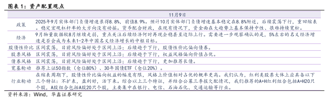 负债端。最新更新的数据显示,2025年9月实体部门负债增速录得8.8%,前值8.9%,基本符合预期。预计10月实体部门负债增速基本稳定在8.8%附近,后续趋于下行,重回缩表。按照目前的财政计划,我们预计年底实体部门负债增速将下降至8.5%附近。金融部门方面,上周资金面边际上基本平稳,月初恢复情况一般,目前判断11月资金面高点出现在6日,后续宏观流动性边际收敛概率上升,这基本符合我们此前的判断。2025年政府工作报告中明确指出:“使社会融资规模、货币供应量增长同经济增长、价格总水平预期目标相匹配”,这表明,稳定宏观杠杆率的大方向没有任何动摇,中国仍然处于边际缩表过程之中,大规模化债进一步降低了地方政府融资成本、以及发生大规模违约和流动性风险的概率,有利于提升全社会的预期。而央行二季度货币政策执行报告再提“防范资金空转”进一步强化了上述判断。