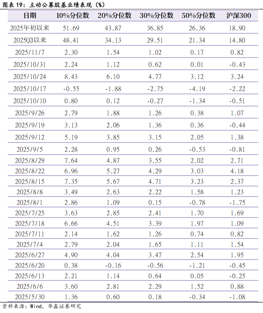 11月第1周(11.3-11.7)主动公募股基部分跑赢沪深300。其中10%、20%、30%和50%周度涨跌幅分别在2.3%、1.5%、1%、0.2%,沪深300周度上涨0.8%。